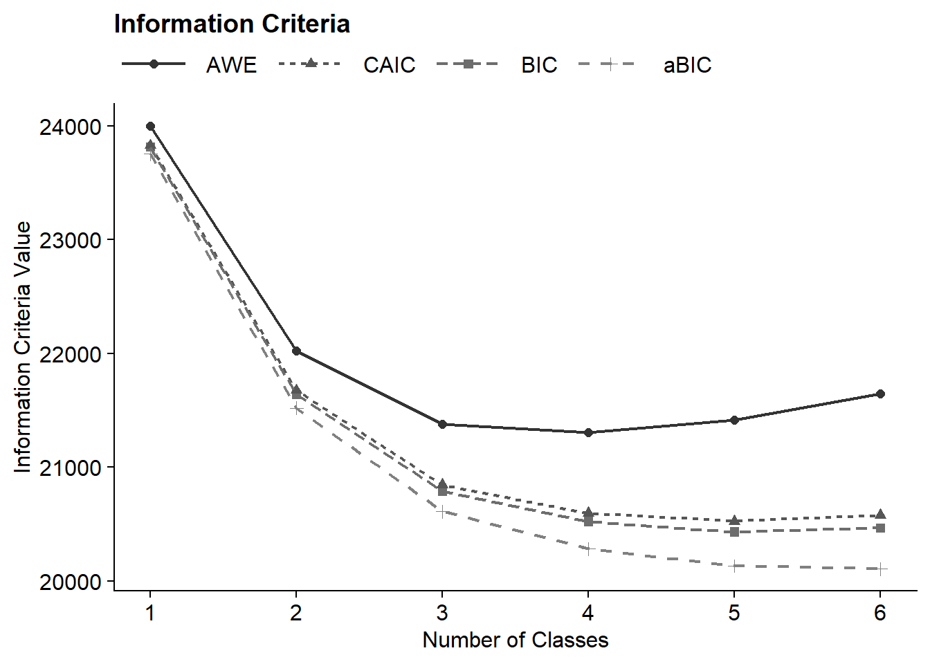 | Classes | Par | LL | BIC | aBIC | CAIC | AWE | BLRT | VLMR | BF | cmPk |