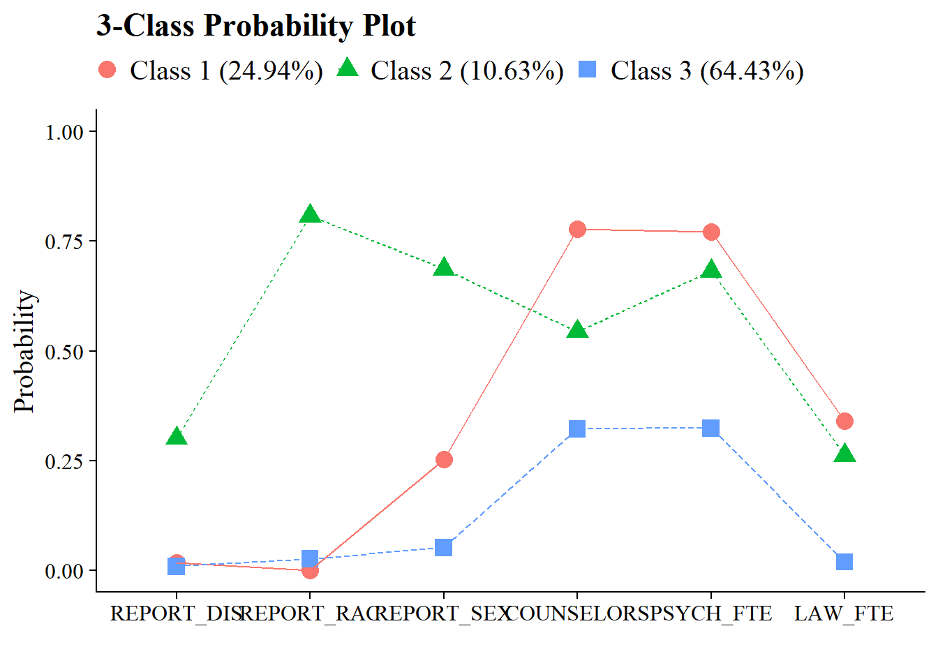 To demonstrate mixture modeling in the training program and online resource components of the IES grant we utilize the Civil Rights Data Collection (CRDC)9 data repository. The CRDC is a federally mandated school-level data collection effort that occurs every other year. This public data is currently available for selected latent class indicators across 4 years (2011, 2013, 2015, 2017) and all US states. In this example, we use the Arizona state sample. We utilize six focal indicators which constitute the latent class model in our example; three variables which report on harassment/bullying in schools based on disability, race, or sex, and three variables on full-time equivalent school staff hires (counselor, psychologist, law enforcement). This data source also includes covariates on a variety of subjects and distal outcomes reported in 2018 such as math/reading assessments and graduation rates.