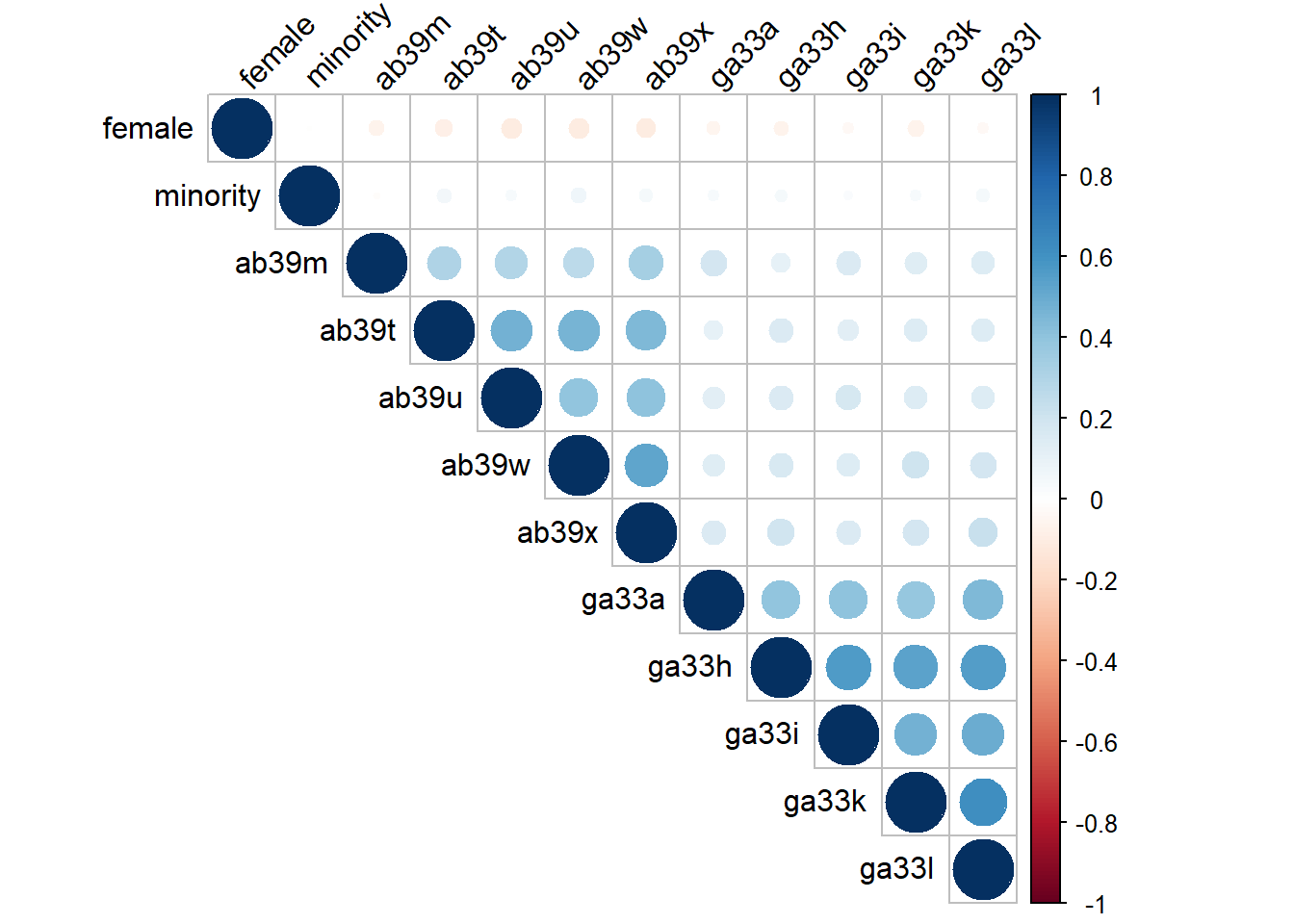 datasummary_correlation(output = "markdown")| female | minority | ab39m | ab39t | ab39u | ab39w | ab39x | ga33a | ga33h | ga33i | ga33k | ga33l | |