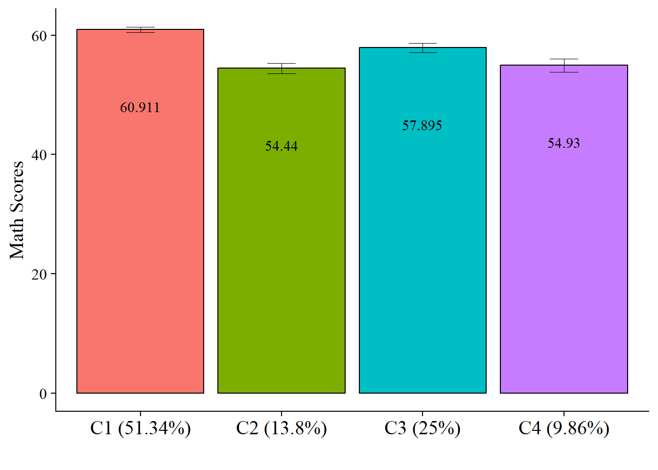 library(reshape2)This example uses Gender and Mother’s Education as predictors of latent class membership and Math IRT scores as a distal outcome in a single model.
