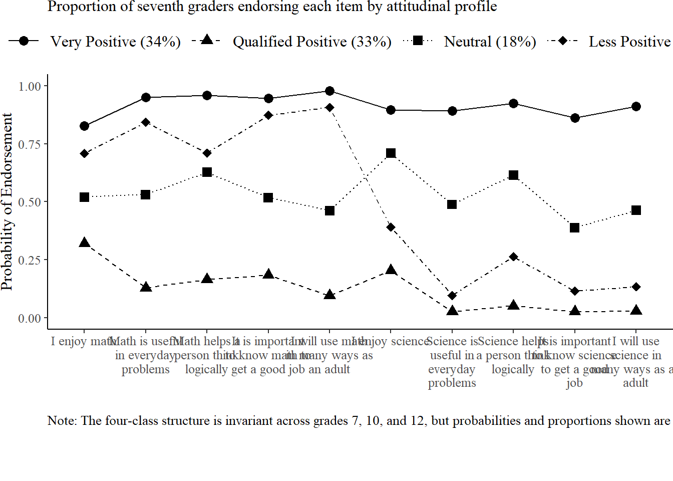 This table provides the overall mean and standard deviation for each attitudinal item at Grades 7, 10, and 12. These values summarize general trends in the full sample and serve as a foundation for the latent class models that follow.