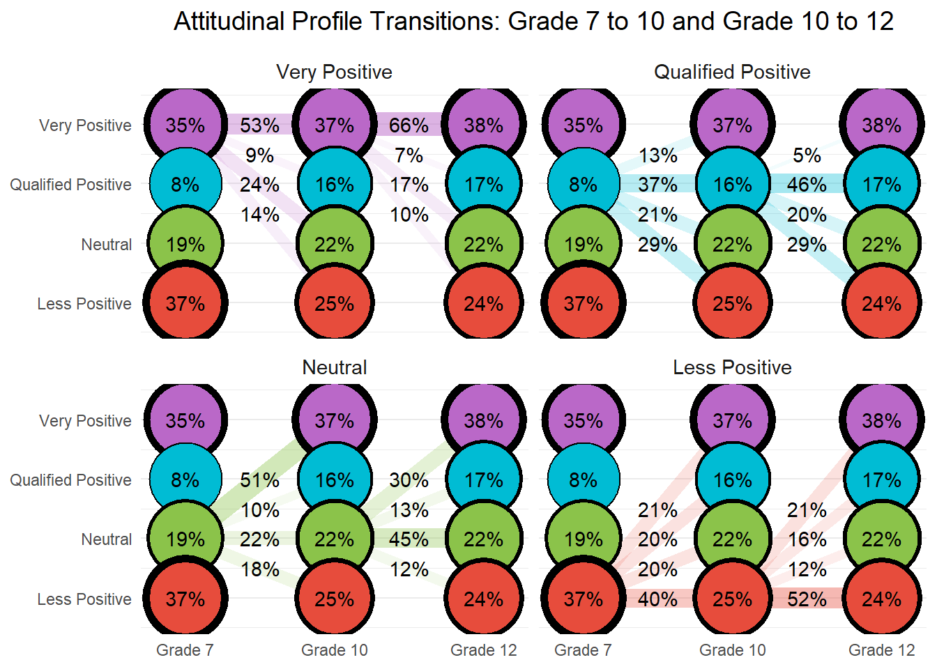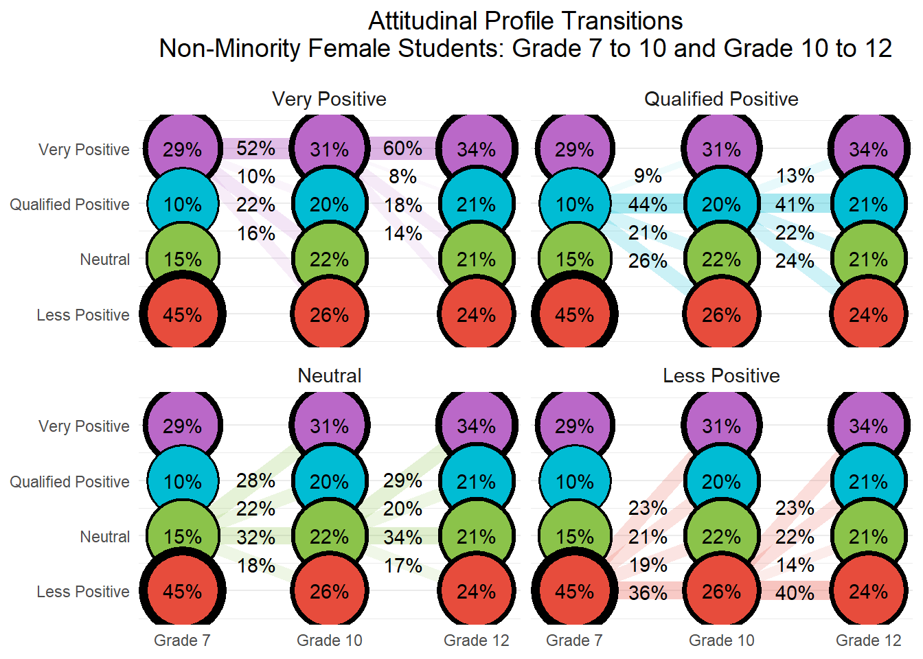 To test for gender differences in attitudinal profile transitions, we computed pairwise z-tests comparing the proportion of female and male students transitioning between each pair of latent classes from Grade 7 to Grade 10. The table below presents cell counts, transition percentages by gender, and two-tailed z-tests for equality of proportions. Statistically significant differences (p < .05) are bolded to highlight transitions where gender-based patterns emerge